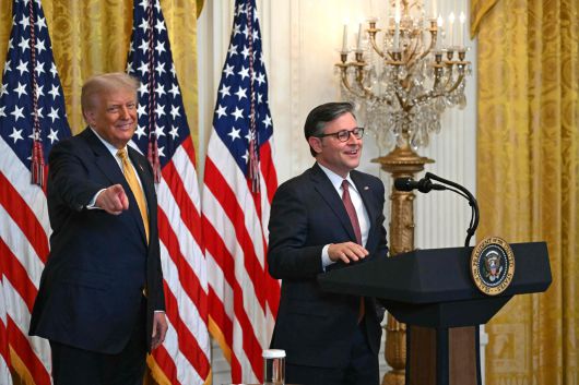 도널드 트럼프 미국 대통령이 22일(현지시간) 백악관에서 공화당 의원들과 함께하는 행사에 참석해 공화당 소속 미 하원의장 마이크 존슨 의원의 연설을 들으며 반응하고 있다. [AFP] |
