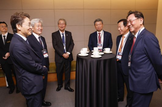 보험업계 인사들 간의 교감도 포착됐다. 안철경 보험연구원장은 구본욱 KB손해보험 대표의 보험 본질 관련 기고문을 언급하며 “마음이 통한다고 느꼈다”며 공감을 표시했다. 안 원장이 “직원들에게 상비약처럼 필요할 때마다 제때 글을 쓰라고 한다”고 말하자 구 대표는 “최근에는 헬스케어 규제와 관련된 글도 작성했다”고 화답했다.