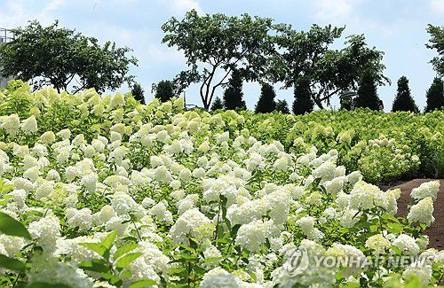 (제주=연합뉴스) 박지호 기자 = 23일 오전 제주시 구좌읍 송당리 동화마을을 찾은 관광객이 꽃을 피우기 시작한 나무수국 정원을 산책하고 있다. 2025.7.23