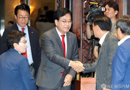 [서울=뉴스핌] 정일구 기자 = 송언석 국민의힘 비상대책위원장 겸 원내대표이 23일 오전 서울 여의도 국회에서 열린 의원총회에 참석하며 의원들과 인사를 나누고 있다. 2025.07.23 mironj19@newspim.com |