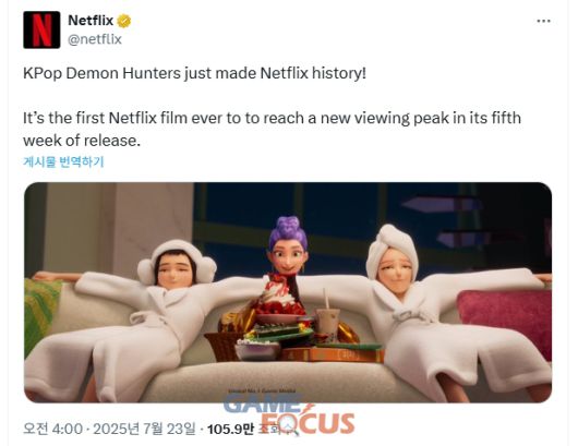 넷플릭스는 23일 공식 X(트위터)를 통해 “케데헌이 공개 5주차에도 시청률 최고치를 갱신한 최초의 넷플릭스 작품이다”라고 전했다.