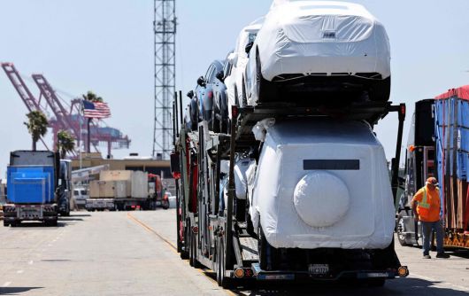 2025년 6월25일, 미국 캘리포니아 롱비치에서 신차들이 도착한 뒤 카캐리어 트럭에 실려 운송되고 있다. 도널드 트럼프 대통령이 중국과의 무역 협상을 위한 마감일을 8월 12일로 설정하는 등, 잠재적인 관세 인상 전에 이를 피하고자 하는 움직임 속에 로스앤젤레스와 롱비치 항에 새로운 물동량의 컨테이너선들이 도착하기 시작했다. AFP연합뉴스 |