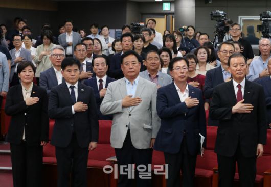 송미령(앞줄 왼쪽부터) 농식품부 장관, 이병진, 어기구, 이만희 국회의원, 홍문표 한국농수산식품유통공사 사장이 개회식에서 국민의례를 하고 있다.