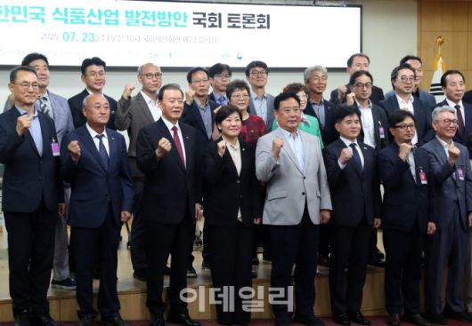 [이데일리 김태형 기자] 홍문표(앞줄 왼쪽 세번째부터) 한국농수산식품유통공사 사장, 송미령 농식품부 장관, 어기구 국회 농해수위원장, 이병진 의원 등이 23일 국회 의원회관에서 열린 ‘대한민국 식품산업 발전방안 국회 토론회’에서 참석자들과 기념촬영을 하고 있다.