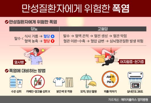 여름은 체온 조절에 어려움을 겪는 만성질환자에게 특히 위험한 계절이다. 폭염으로 탈수 증상은 혈당 수치를 높이고 혈전 발생을 유발해 질환을 악화시킬 수 있다. 또한, 장시간 외부에 있을 때는 건강한 사람보다 온열질환에 쉽게 노출될 수 있어서 심하면 사망에 이를 수 있어 각별한 주의가 요구된다.