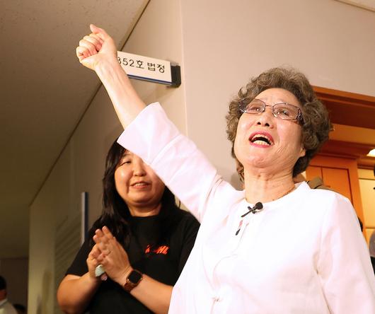 61년 전 자신을 성폭행하려던 남성의 혀를 깨물어 중상해 혐의 유죄 판결을 받았던 최말자(78)씨가 23일 부산지법에서 열린 재심 첫 공판을 마치고 법정을 나서며 ″이겼습니다″를 외치고 있다. 연합뉴스 |