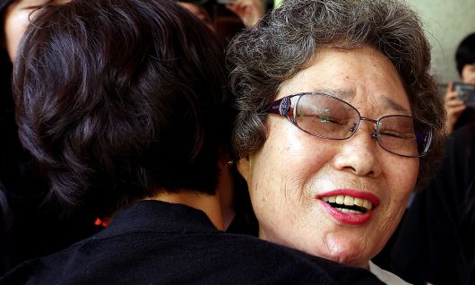 61년 전 자신을 성폭행하려던 남성의 혀를 깨물어 중상해 혐의 유죄 판결을 받았던 최말자(78)씨가 23일 부산지법에서 열린 재심 첫 공판을 마치고 법정을 나서며 변호인과 여성단체와 포옹하고 있다. 연합뉴스 |