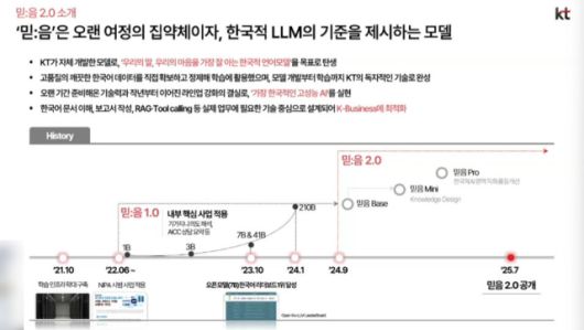 또한, KT AI 서비스 기가지니와 국내 최대 규모의 AI 고객센터 운영을 통해 믿:음의 방대한 실사용 데이터를 축적하고 있다. 이를 바탕으로 AI가 단순히 기술이 아닌 실용 사례로서 국민들이 일상 속에서 AI의 가치를 누릴 수 있도록 접근성을 확장하며 '모두를 위한 AI'를 구현 중이라는 설명이다.
