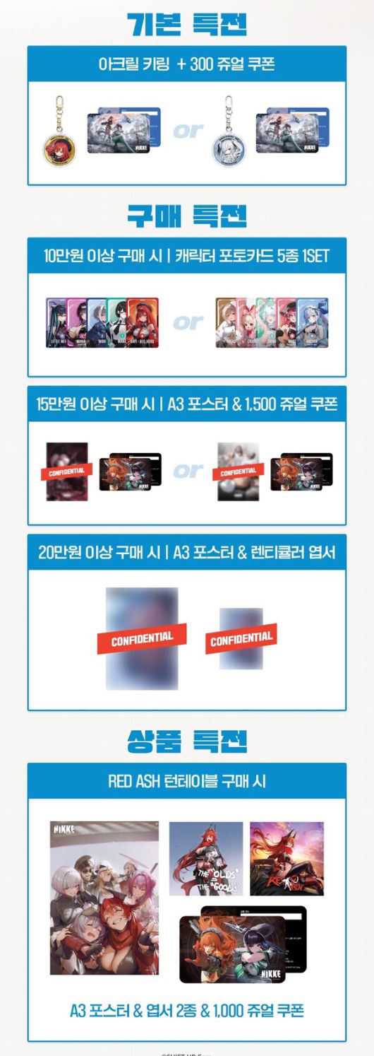 10만 원 이상 구매 시 캐릭터 포토카드 세트(2종 중 랜덤 1종), 15만 원 이상 시 A3 포스터(랜덤)와 1500 쥬얼 쿠폰, 20만 원 이상 시 렌티큘러 엽서와 A3 포스터가 제공된다. RED ASH 턴테이블을 구매하면 엽서 2종과 포스터, 1000 쥬얼 쿠폰이 함께 증정된다.