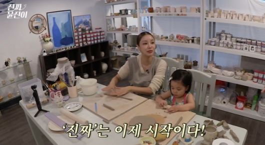 이날 윤진이는 딸 제이와 함께 공방에서 그릇을 만들었다. 가장 먼저 찰흙을 두드려서 공기를 뺀 그는 "남편을 생각하며!"라며 찰흙을 사정없이 내려쳐 웃음을 자아냈다. 그는 "잘 쳐지는데?"라고 너스레를 떨었다.