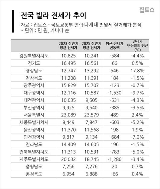 23일 부동산 중개업체 집토스가 2023년 상반기와 2025년 상반기 전국 연립·다세대 실거래 데이터를 비교 분석한 결과 동일 평형의 전세 계약이 있었던 1만4550개 평형(타입) 중 31.9%에 달하는 4641개에서 전세 보증금이 하락한 것으로 확인됐다.