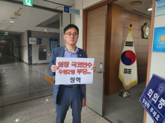 이날 심사위가 열린 자리 앞에서는 국민의힘 장혁 시의원이 ‘의장 국외연수 수행 2명 부당’이라는 문구가 적힌 손팻말을 들고 1인 시위를 벌이며 문제를 제기했다.
