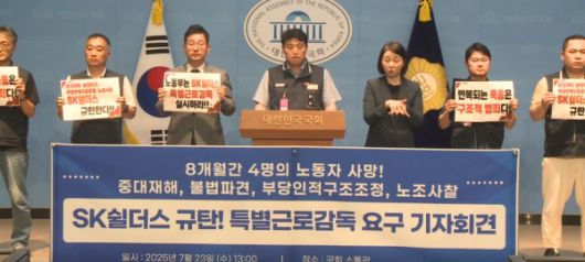 이 원내부대표는 지난 22일 원대대책회에서 "노동자들의 죽음이 반복되는 원인은 SK쉴더스의 이윤 중심의 경영 구조에 있다"며 "고용노동부는 즉각 SK쉴더스에 대핸 특별 산업 안전감독과 특별 근로 감독에 나서야 한다"고 강조했다. 그는 "규정상 1년 내 3회 이상 중대재해 사망재해가 발생하면 특별감독 대상"이라며 철저한 진상 조사와 책임자 처벌을 요구했다.