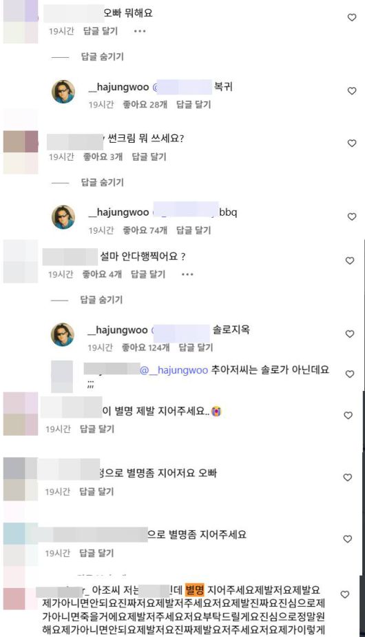 하정우는 "좋은 이름 지어줄 수 있나요?", "조○○으로 별명 지어주세요", "정○○ 김○○으로 별명 좀 지어주세요", "○○이 별명 제발 지어주세요" 등의 댓글에는 답변하지 않았다.