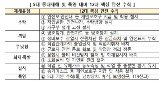 이번 프로젝트는 산재 사망의 60% 이상을 차지하는 추락·끼임·부딪힘 등 후진국형 사고를 집중 타깃으로 삼는다. 여기에 화재·폭발, 질식, 폭염 등 대형 재해 우려가 있는 분야까지 포함해 총 6대 위험요소에 대한 ‘12대 핵심 안전수칙’을 새롭게 정리해 점검한다.