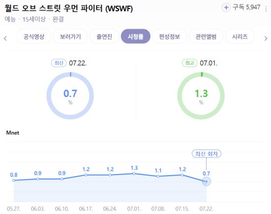 22일 방송된 '스우파3' 최종회는 0.7%(닐슨코리아 전국 유료가구 기준)를 기록했다. 이는 직전 회차인 15일 방송분이 기록한 1.2%에 비해 절반에 가깝게 하락한 수치이자, '스우파3' 전체 회차 중 최저 시청률이다.
