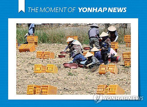 (강릉=연합뉴스) 유형재 기자 = 23일 강원 강릉시 한 농촌 마을에서 베트남 전통 모자인 '논라'를 쓴 외국인 노동자들이 감자를 캐고 있다. 2025.7.23 [THE MOMENT OF YONHAPNEWS]