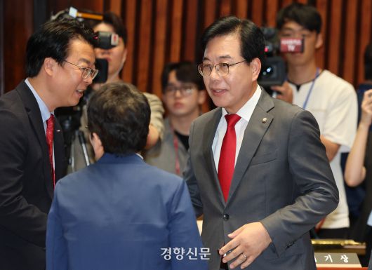 송언석 국민의힘 비상대책위원장 겸 원내대표(오른쪽)가 23일 국회에서 열린 의원총회에 입장하고 있다. 박민규 선임기자 |