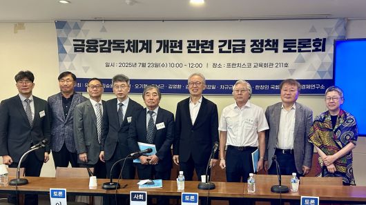 국회 정무위원회 소속 김남근 더불어민주당 의원 등은 23일 서울 중구 프란치스코 교육회관에서 ‘금융감독체계 개편 관련 긴급 정책 토론회’를 열고 금융감독체계 개편 방안을 논의했다.