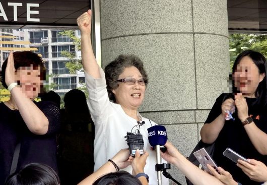 1년 전 자신을 성폭행하려던 남성의 혀를 깨물어 중상해 혐의 유죄 판결을 받았던 최말자 씨(79)가 23일 부산지법에서 열린 재심 첫 공판을 마치고 법원 앞에서 손을 치켜들며 기뻐하고 있다. 이날 검찰은 “정당방위가 인정된다”며 최 씨에게 무죄를 구형하고 사죄했다. 부산=뉴시스 |