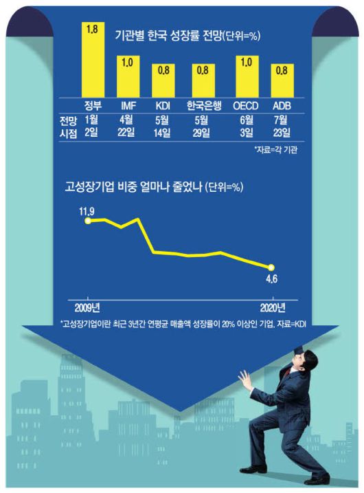 정부를 비롯한 국내외 기관들이 올해 한국 성장률을 1% 아래로 낮춰 잡으며 0% 성장률이 굳어지는 모양새다. 수출 주도형 개방경제인 한국에 통상 불확실성 확대가 직격탄이 된 것이다. 문제는 국내 경제의 핵심 축인 고성장기업들 역시 점차 줄어들고 있는 것으로 나타나 미국의 관세 조치 등 외부 변수가 아닌 내부 경제 성장 동력이 약화되고 있다는 점이다. 한국이 장기 저성장 국면으로 고착화되는 것을 막기 위해선 신성장 동력 발굴을 위한 기업활동 지원에 힘써야 한다는 목소리가 나온다.