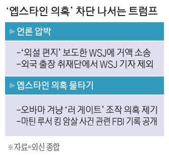 트럼프 대통령은 의혹을 덮기 위해 다른 이슈를 선제적으로 제시하면서 국면 전환에 열을 올리고 있다. 오바마 전 대통령이 정치 공작에 나섰다는 주장이 대표적이다. 트럼프 대통령은 이날 백악관에서 진행한 페르디난드 마르코스 주니어 필리핀 대통령과의 정상회담에서 기자들이 엡스타인 관련 질문을 쏟아내자 "갱단의 두목은 오바마 (전) 대통령"이라면서 "그는 유죄이며 이것은 반역죄"라고 말했다. 2016년 대선 당시 자신의 선거 캠프가 러시아 측과 공모해 미국 대선 개입을 유도했다는 '러시아 게이트' 의혹이 오바마 전 대통령 주도로 정보를 조작해 빚어낸 작품이라는 것이다.