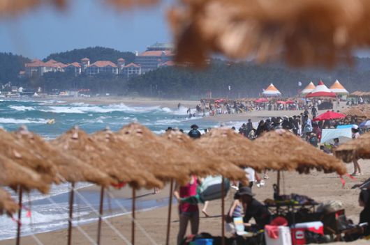 가림막 아래서 더위를 피하는 여름 휴가지의 사람들. [사진=연합뉴스] |