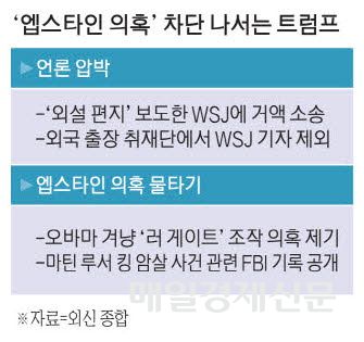 아울러 트럼프 행정부는 엡스타인 관련 보도를 이어가는 언론에도 재갈을 물리고 있다. 월스트리트저널(WSJ)은 지난 17일 트럼프 대통령이 2003년 50번째 생일을 맞은 엡스타인에게 여성의 나체 그림이 담긴 외설스러운 편지를 보냈다고 보도했다. 해당 보도에 대응해 트럼프 대통령은 WSJ를 상대로 100억달러(약 14조원)에 달하는 거액의 손해배상을 요구하는 명예훼손 소송을 제기했다. 아울러 대통령 해외 출장 취재진에서도 백악관 출입 WSJ 기자를 제외했다.