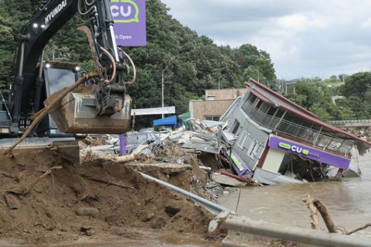 21일 오전 경기도 가평군 수해로 인해 조종면의 한 편의점 건물이 하천에 무너져 내렸다. 전민규 기자 |
