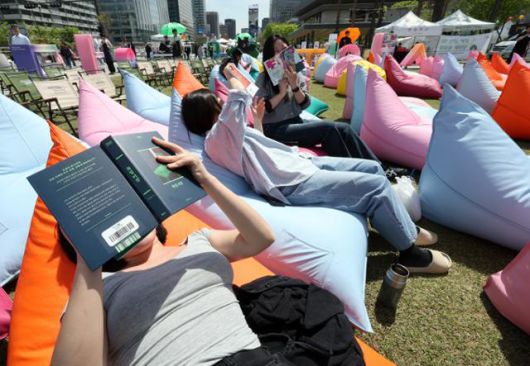 세계 책과 저작권의 날인 지난 4월 23일 서울 종로구 광화문광장에 마련된 서울야외도서관 광화문 책마당에서 시민들이 빈백 소파에 기대어 독서 삼매경에 빠져 있다. 국어 기초학력 미달 학생 증가를 막기 위해선 무엇보다 문해력과 사고력을 증진시켜줄 독서교육이 우선해야 한다. 뉴스1 |