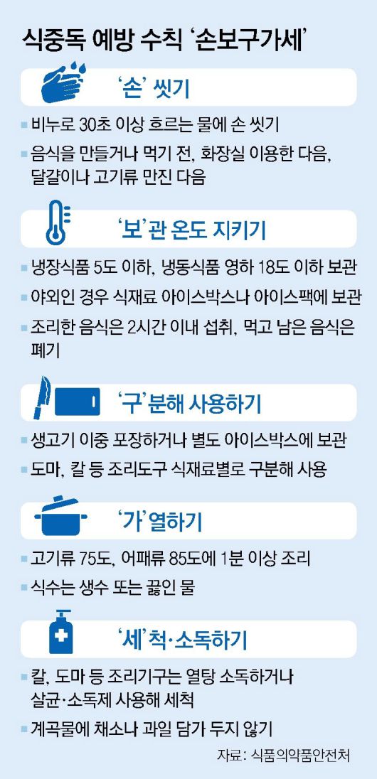 식품의약품안전처는 본격적인 여름 휴가철을 맞아 캠핑 등 야외활동을 할 때 식중독이 발생하지 않도록 예방수칙인 ‘손보구가세’ 실천을 당부했다. ‘손보구가세’는 손 씻기, 보관, 구분, 가열, 세척 및 소독 등 5대 예방수칙의 앞 글자를 따서 만든 슬로건이다.