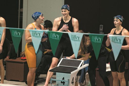 /게티이미지코리아트랜스젠더 수영 선수 리아 토머스(가운데)가 지난 2022년 2월 미국 아이비리그 수영·다이빙 챔피언십 여자 800m 계영 경기 후 팀 동료들과 함께 웃고 있다. |