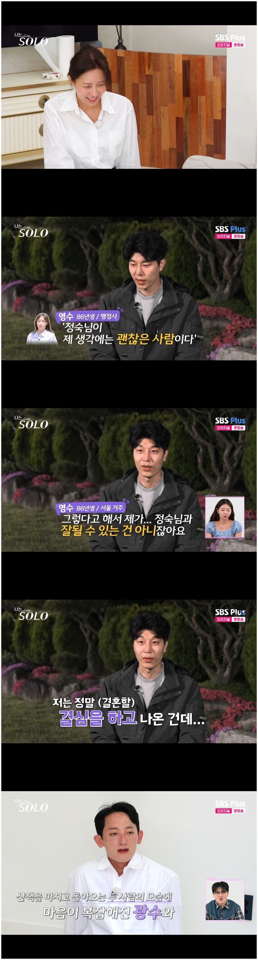그러나 이런 벽을 세우고 있는 영수 자체가 미련덩어리였다. 그리고 일단 대화를 해 보자고 생각하던 상철은 고민에 빠졌다. 그는 지역적으로는 가까운 옥순과 대화를 하지만, 너무나 고민스러운 눈치였다.