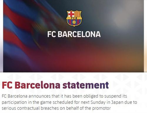 바르셀로나 구단은 24일(한국시간) "프로모터의 중대한 계약 위반으로 오는 일요일(27일) 일본에서 예정된 경기에 참가할 수 없게 됐음을 알린다"고 발표했다.