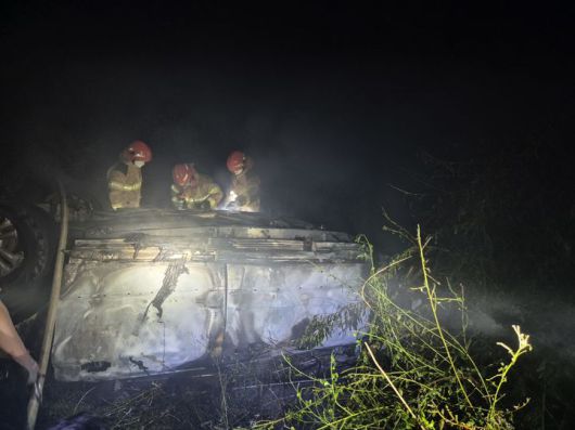 [청양=뉴시스] 지난 23일 오후 11시5분께 충남 청양군 칠갑산터널 인근 야산에서 난 차량화재 현장에서 소방대원이 사고 원인을 조사하고 있다. (사진=청양소방서 제공) 2025.07.24.  photo@newsis.com *재판매 및 DB 금지