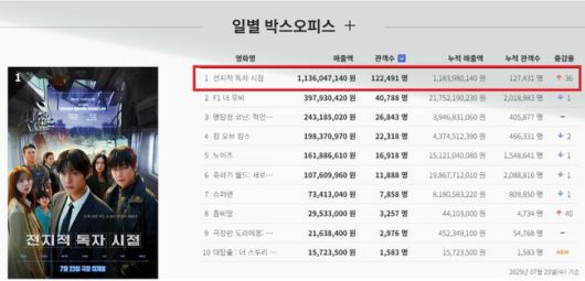 올여름 가장 강력한 영화적 체험을 선사할 것을 예고한 '전지적 독자 시점'이 개봉 첫날 박스오피스 1위에 오르며 여름 극장가에 시원한 흥행 열풍의 시작을 알렸다. 영화관입장권 통합전산망에 따르면 '전지적 독자 시점'은 개봉일(23일) 하루 동안 122,491명의 관객을 동원하며 박스오피스 최정상 자리를 차지했다.