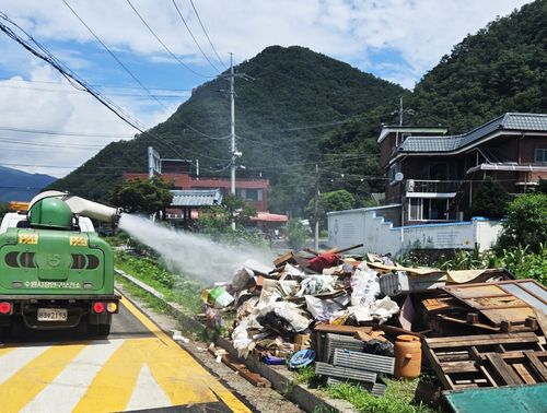 인력 접근이 어려운 산사태 지역에는 방역특장차 1대를 동원, 방역약품을 활용해 감염 매개체 서식처를 집중적으로 소독했다.