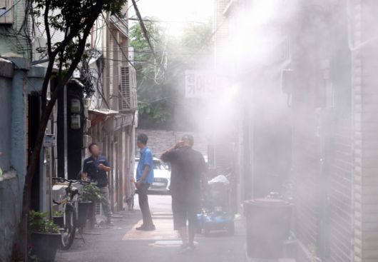 지난 8일 오후 서울 용산구 동자동 쪽방촌에서 주민들이 쿨링포그 아래에서 더위를 피하고 있다. 이날 오후 2시쯤 서울 기온은 37.1도까지 오르면서 7월 상순 기온으론 역대 최고치를 기록했다./사진=뉴스1 |