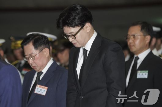 한동훈 국민의힘 전 대표가 29일 경기 평택시 해군 2함대사령부에서 열린 '제2연평해전 승전 23주년 기념식'에서 묵념을 하고 있다. (공동취재) 2025.6.29/뉴스1 ⓒ News1 김영운 기자 |