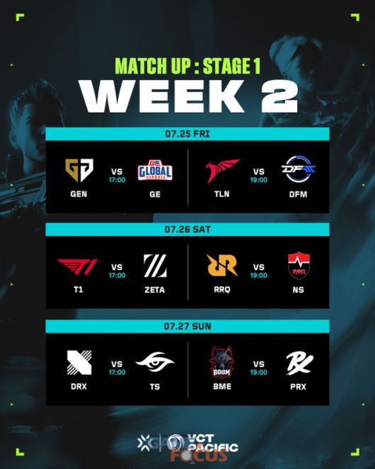 5대5 대전형 캐릭터 기반 전술 슈팅 게임 '발로란트'의 개발 및 유통사인 라이엇 게임즈(한국 대표 조혁진)는 25일(금)부터 27일(일)까지 서울 마포구 상암동에 위치한 상암 SOOP 콜로세움에서 열리는 VCT 퍼시픽 스테이지 2 2주차 경기를 예고했다. 알파 그룹에 속한 세 개의 한국팀-젠지, 농심 레드포스, DRX-의 행보에 관심이 모이고 있다.