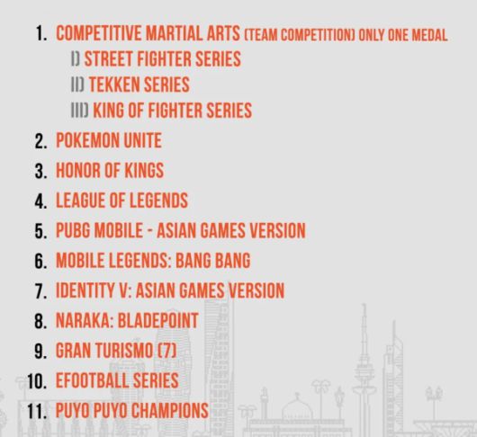 일본e스포츠연합(JeSU)은 24일 '2026 아이치·나고야 아시안게임'에서 정식 종목으로 채택된 e스포츠의 세부 종목 명단을 공개했다. 이는 지난 2월 아시아올림픽평의회(OCA)가 선정한 명단을 재확인한 것이다.