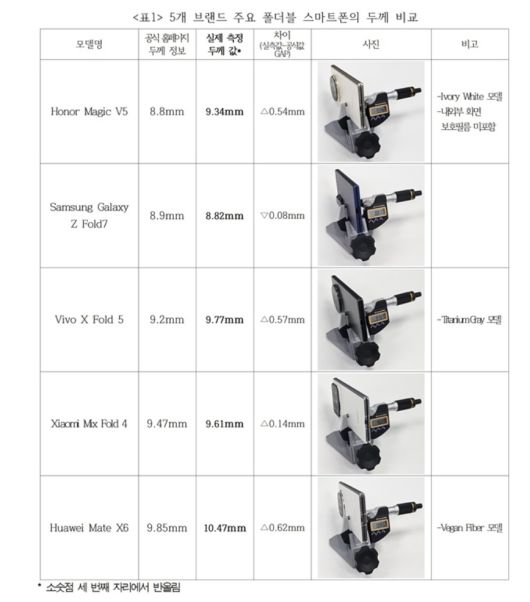 반면 삼성전자의 ‘갤럭시Z폴드7’은 공식 두께(8.9mm)보다 실제 측정값(8.82mm)이 오히려 0.08mm 더 얇게 나타났다. 5개 제조사 중 실측값이 스펙보다 얇았던 유일한 제품이다.