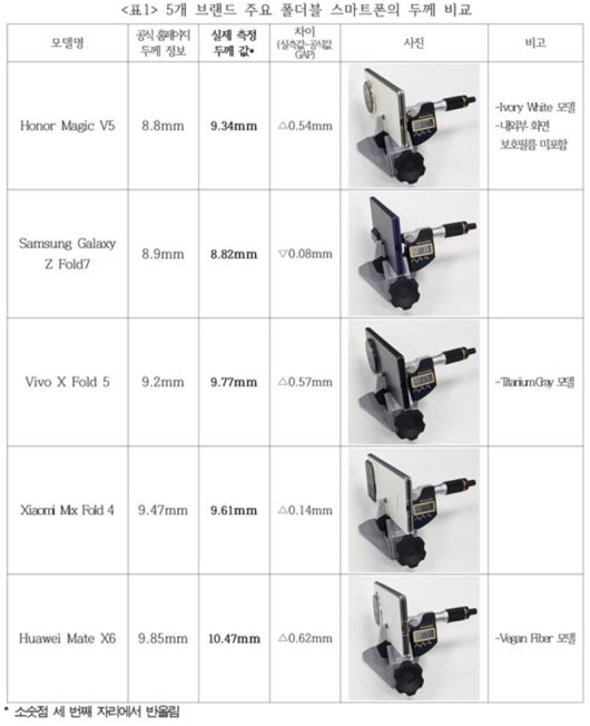 협회는 외측 마이크로미터를 사용해 접은 상태에서 카메라 돌출부와 테두리 부분을 제외한 두께를 측정한 결과, 각 브랜드별 제조사가 제공하는 제품 두께 정보와 실제 측정 값은 최대 약 0.6㎜ 정도 차이가 있었다.