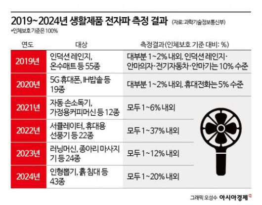 과기정통부는 2019년부터 매년 국내에서 유통되는 ICT 제품과 생활공간의 주요 시설 중 국민적·사회적 관심에 따라 측정 대상을 선정해 전자파 측정 결과를 공개한다. 2019년부터 올해 상반기까지 모두 166종 506개 제품과 2만2932곳의 생활공간 주요 시설의 전자파를 측정했다.