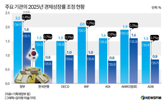 아시아개발은행(ADB)의 경제성장률 전망치의 경우 하락 폭이 큰 편이었다. ADB는 전날(23일) 한국 올해 경제성장률을 0.8%로 전망했다. 기존 전망치 1.5% 대비 절반 수준인 0.7%p가 떨어진 수치다.