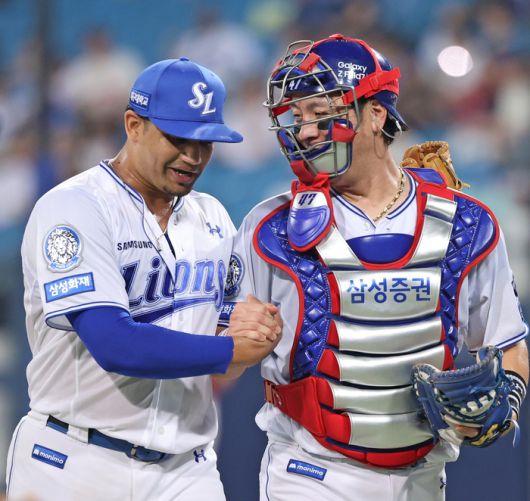 삼성 가라비토(왼쪽)가 23일 대구삼성라이온즈파크에서 열린 2025 KBO리그 SSG전에 선발 등판해 7회까지 무실점으로 막은 후 마운드에서 내려오며 강민호와 기쁨을 나누고 있다. 사진 | 삼성 라이온즈 |
