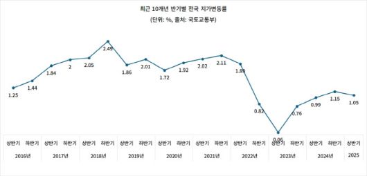 국토교통부와 한국부동산원이 24일 발표한 ‘2025년 상반기 전국 지가변동률 및 토지거래량’ 통계에 따르면 작년 하반기(1.15%) 대비 상승률이 0.10%포인트 낮아진 수치다. 단, 전년 동기(0.99%)보다는 0.06%포인트 높았다.