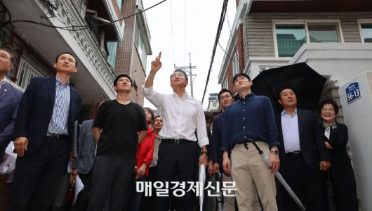 지난 14일 오세훈 서울시장이 신속통합 재개발 지역으로 지정된 자양 4동 A 구역을 찾아 지역 주민들과 둘러보고 있는 모습. [매경DB] |