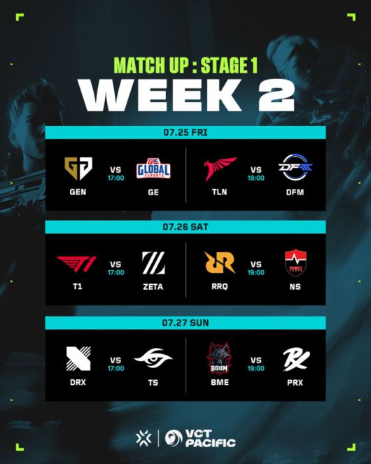 5대5 대전형 캐릭터 기반 전술 슈팅 게임 '발로란트'의 개발 및 유통사인 라이엇 게임즈는 25일(금)부터 27일(일)까지 서울 마포구 상암동에 위치한 상암 SOOP 콜로세움에서 열리는 VCT 퍼시픽 스테이지 2 2주 차에서 알파 그룹에 속한 세 개의 한국팀-젠지, 농심 레드포스, DRX-의 행보에 관심이 모이고 있다고 밝혔다.