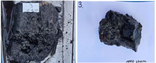 ▲(좌)빈번한 빈산소 상태로 인한 혐기화 상태가 오래 유지되어 있는 퇴적토, (우)색을 비교하기 위해 하얀 바탕지에서 찍은 모습 ⓒ새만금시민생태조사단 |